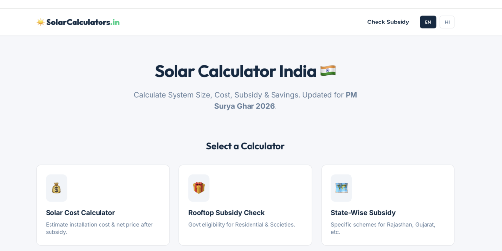 The platform provides a range of free solar calculators tailored for Indian users. Key tools include: